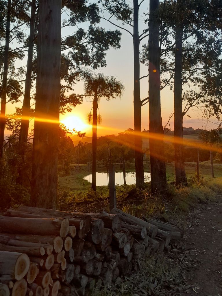 Relação da foto ao tema do concurso: Essa foto representa o contato direto com a natureza, o trabalho com a terra e a madeira, e o ciclo diário do amanhecer ao entardecer. O pôr do sol entre as árvores e a pilha de lenha simbolizam o fim de um dia de trabalho, lembrando o esforço e a dedicação das pessoas que constroem o município com coragem e esperança. A cena transmite tranquilidade, força e continuidade, mostrando que o trabalho rural é parte viva da história e das origens de Rolante. Cada tronco cortado e cada raio de sol reforçam a ideia de que o progresso nasce do esforço coletivo e do amor pelo que se faz.