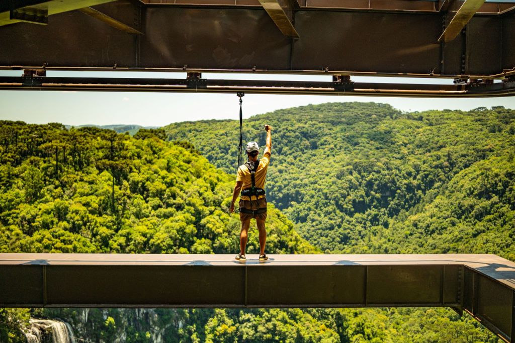 Desde o final de janeiro, o Parque do Caracol, em Canela, conta com uma nova experiência de turismo de aventura contemplativa, e única do tipo no país. O atrativo estava funcionando em formato de soft open desde o dia 18 de dezembro. A atividade chamada de “Corajoso” explora a liberdade ao permitir que os visitantes contemplem a Cascata do Caracol enquanto caminham por uma viga metálica com menos de 1 metro de largura, presos somente pela estrutura superior, sem apoio nas laterais.