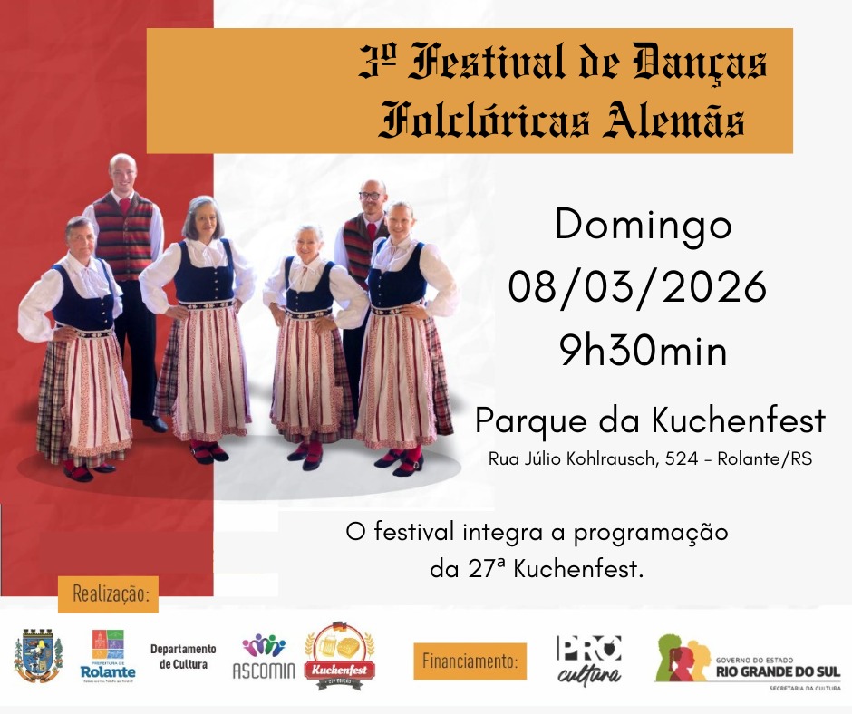 Uma das manifestações culturais mais tradicionais trazidas pelos imigrantes alemães será celebrada na manhã de domingo (08), durante a programação da 27ª Kuchenfest de Rolante. O 3º Festival de Danças Folclóricas Alemãs reunirá nove grupos, vindos de diferentes municípios do Rio Grande do Sul que vão promover uma celebração cultural. A programação inicia às 9h30 e se estende até o final da manhã no Parque da Kuchenfest.