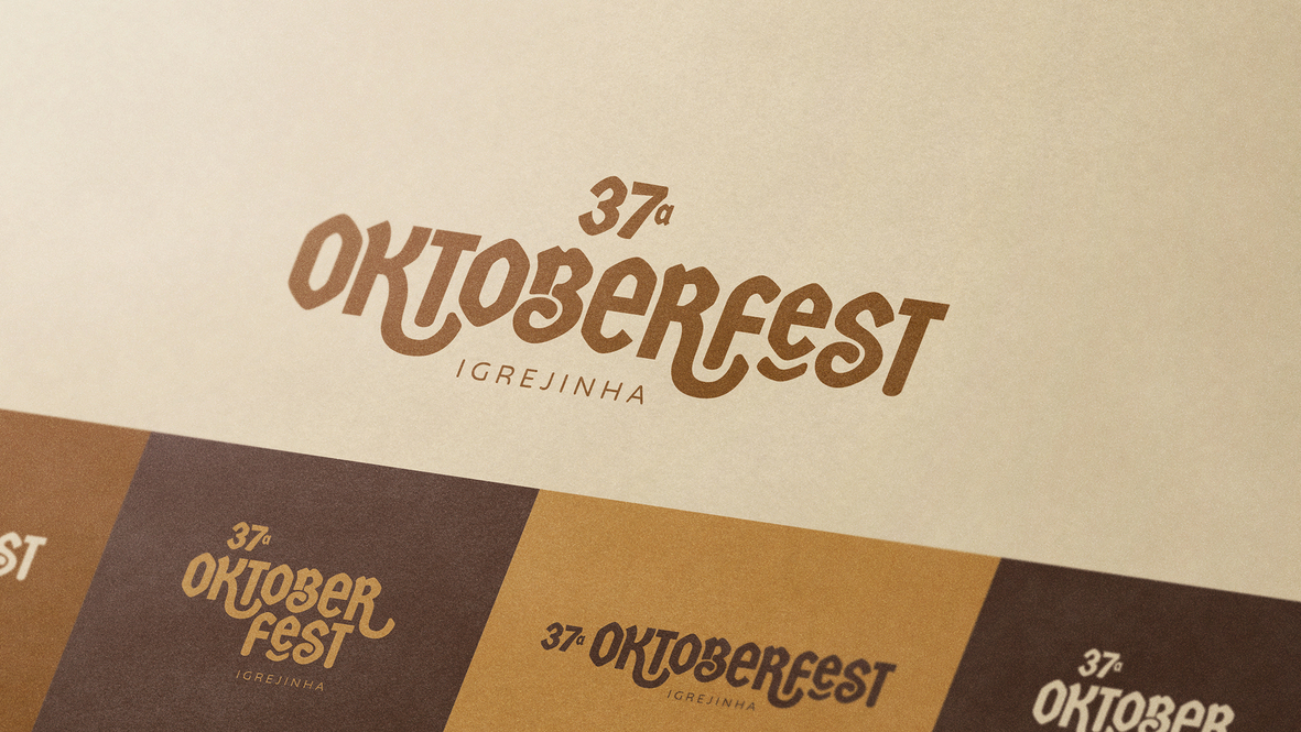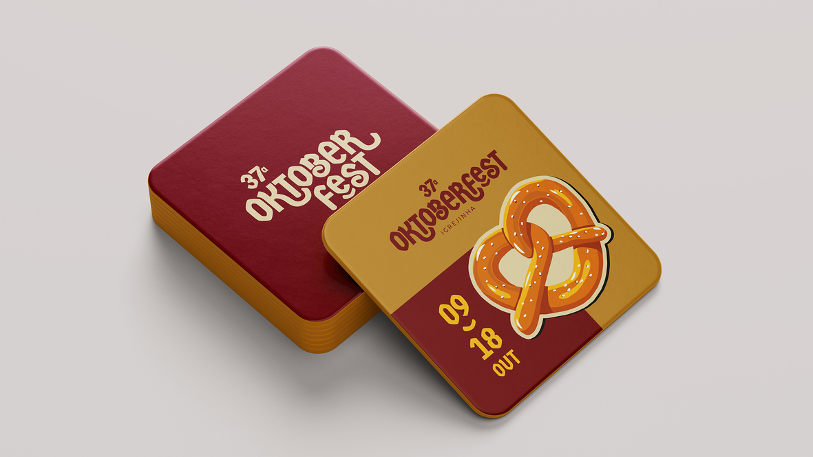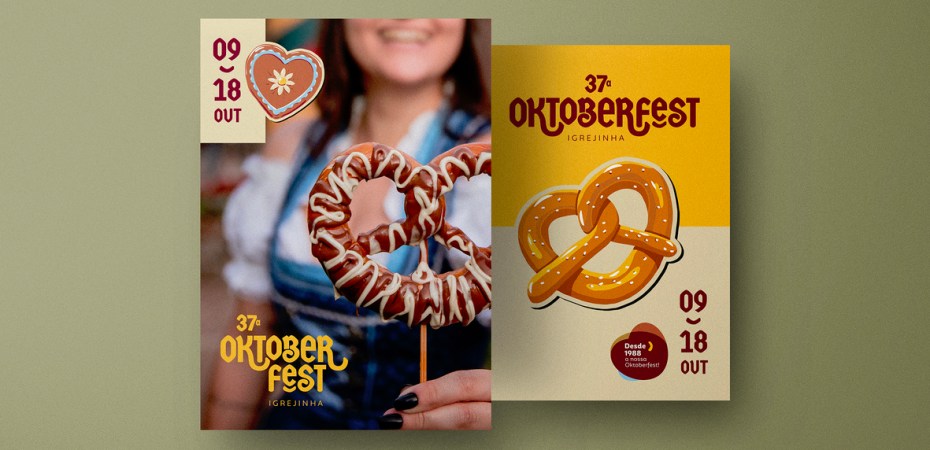 Ícones ilustrados manualmente, com traços leves e orgânicos, representam símbolos festivos, incluindo chapéu típico, pretzel, caneco de chopp, instrumento musical, lebkuchenherz e arquitetura enxaimel. A assinatura gráfica, por sua vez, equilibra robustez e leveza, com organização visual mais limpa, uso estratégico de boxes informativos e harmonia cromática.