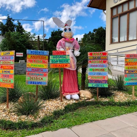Decoração de Páscoa em Igrejinha traz coelhinhos de máscara e homenagem aos profissionais de saúde
